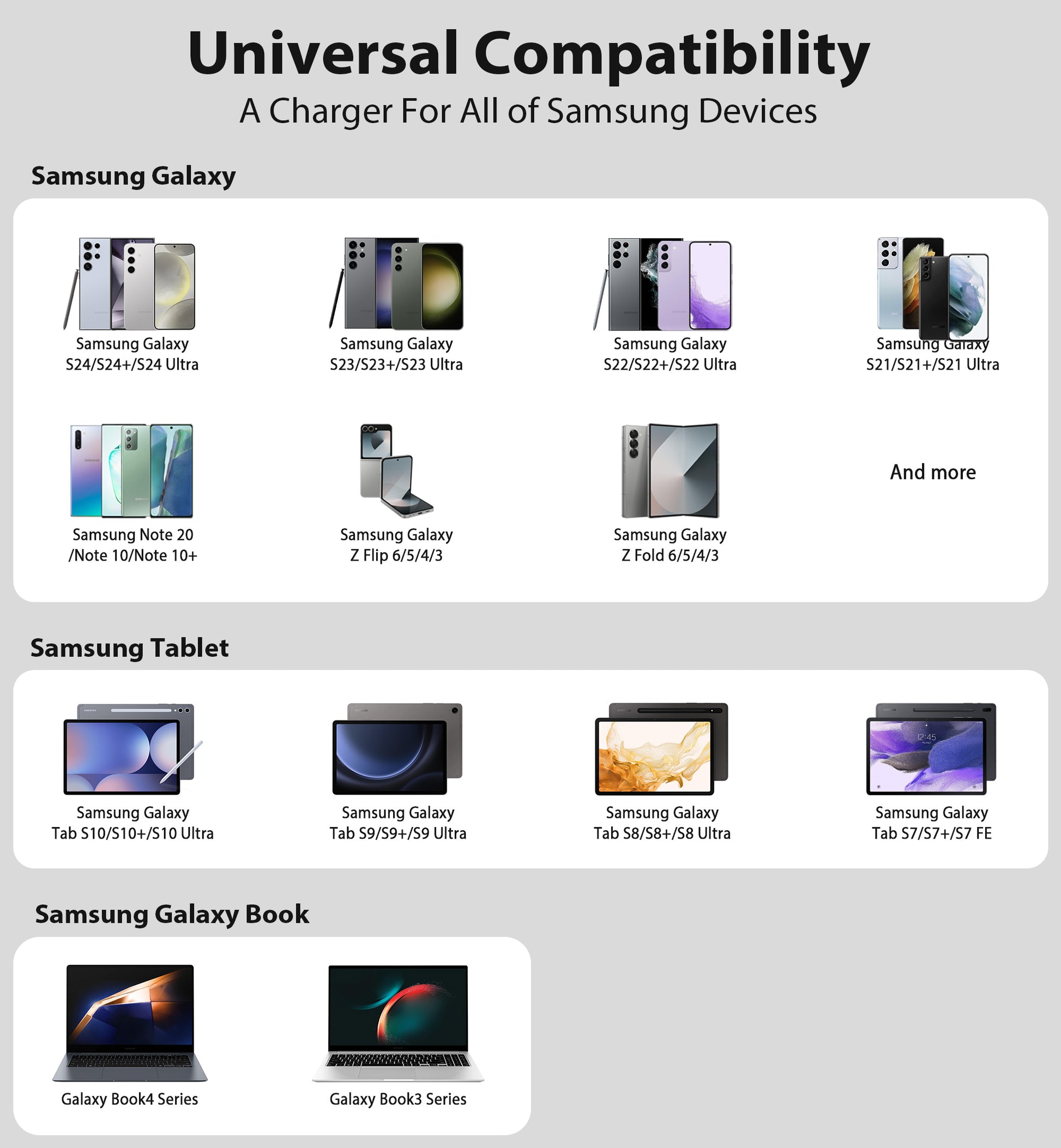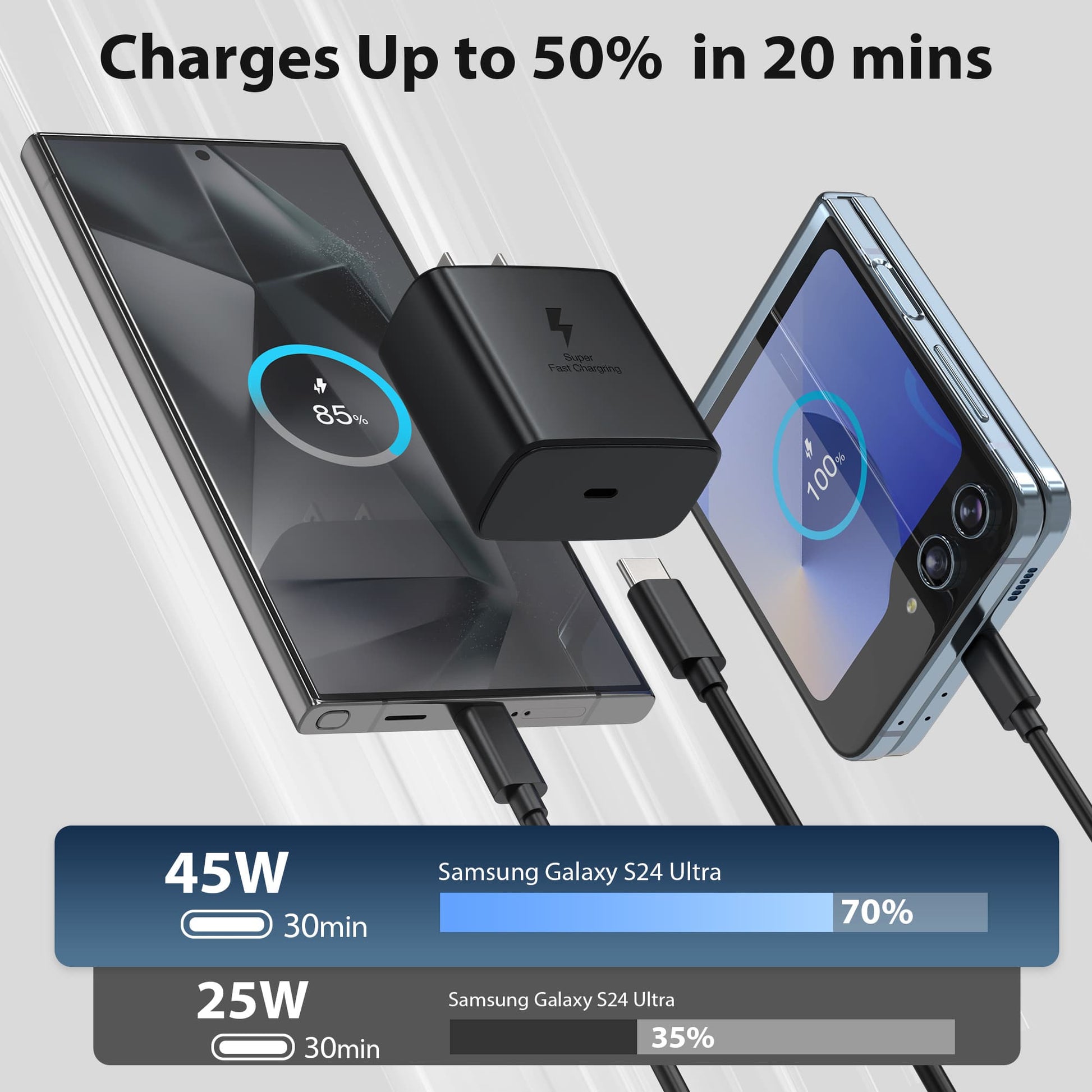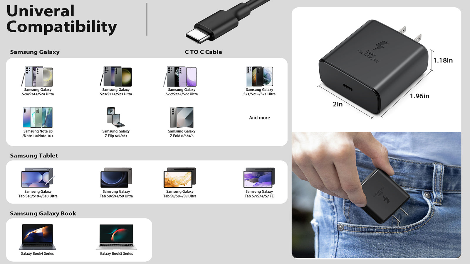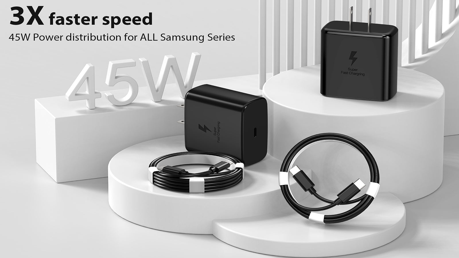 Professionals, students, Samsung users, and anyone else who depends on their devices on a regular basis will find this Samsung tablet and phone charger ideal. Whether you're working, studying, traveling, or playing video games, having a dependable, quick-charging 45W charger guarantees that you're constantly charged. With the 2-pack option, you can keep one at home, in your car, or at work, ensuring that you never forget your charger again. Use this Samsung 45W super fast charger to enhance your charging experience and take advantage of dependable, safe, and quick electricity whenever you need it.