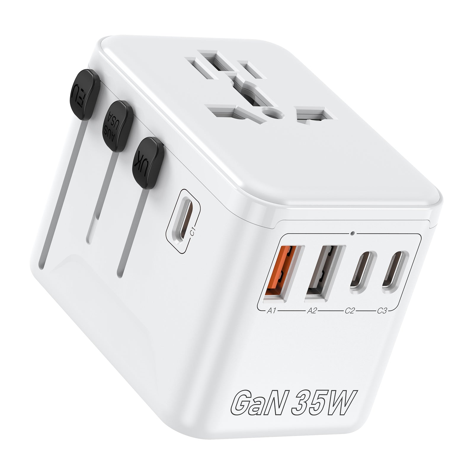 When performance and versatility are non-negotiable, the 35W Universal Travel Adapter delivers. Designed with fast charging GaN technology, this all-in-one global charger powers up your essential devices with unmatched speed and reliability. With 3 USB-C and 2 USB-A ports, support for EU/US/UK/AUS plug types, and compact energy-efficient design, it’s the premium charging solution for travelers who carry more and move faster.